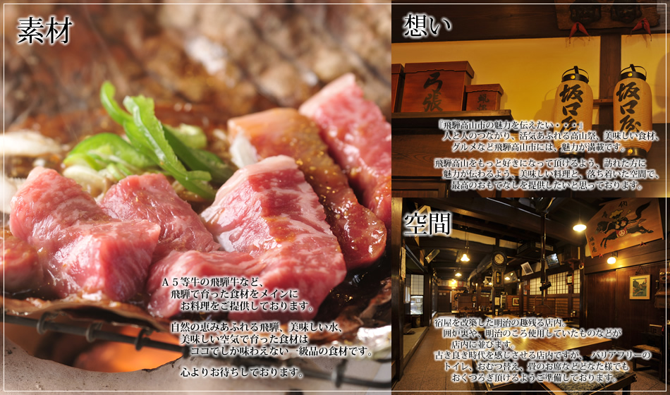 ご当地素材である、飛騨牛や郷土料理が堪能できるお店として